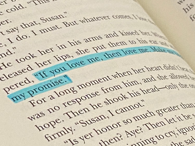 “If you love me, love me” Susan tells him, “make me break my promise.” (p. 406). She’s challenging him to make the decision for her. Later he plays the exact same card on top of hers, challenging her to say the same thing again and give him another chance. “Say it again and I will, Susan. I don’t know if that’s a promise or a warning or both at the same time, but… say it again and I will.” (p. 422). It’s their own lover’s version of the stand-off in the Traveler’s Rest.