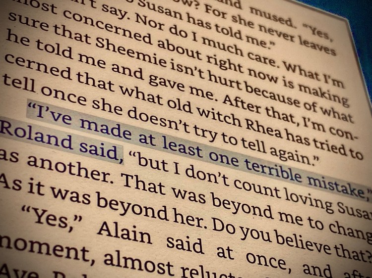 When Cuthbert confronts him outside the bunkhouse, showing him Rhea’s intercepted note and sucker-punching some sense into him, Roland admits he has “been a fool…I’ve made at least one terrible mistake.” (p. 622) Later he explains to his best friend that the mistake he was referring to was “thinking that love could somehow be apart from everything else. That I could live two lives—one with you and Al and our job here, one with her.” (p. 629). That’s true, but I don’t think it’s the whole truth. It’s not just that Roland tried to keep his ka with Susan separate from his ka-tet; it’s that he never viewed Susan as an equal.