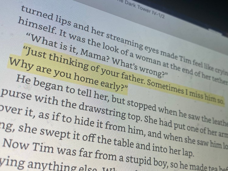King’s own father left the family when he was only a few years old, so it’s not hard to draw connections between the author’s life and the lives he creates for his characters (and I’m sure I’m not the first to point them out). Considering this though, I find it fascinating that he chose to construct a fantasy world in which the high water mark of dignity is remembering the face of one’s father.