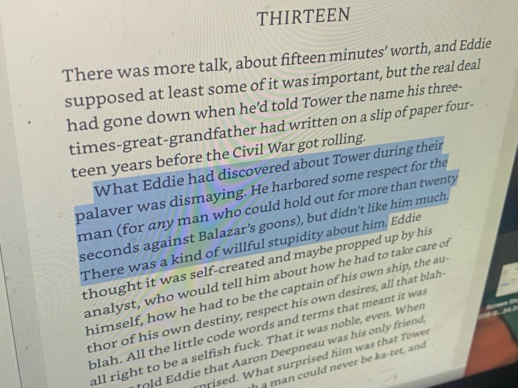 There is also a sense that the ka-tet (and even Balazar’s goons) think of Tower as a spoiled brat. Here’s this guy who’s responsible for keeping the rose, and subsequently the universe, safe and he is just throwing his family’s fortune down the drain, gambling the future of existence so he can keep his vanity bookstore open. I think this makes Jake contemplate his own privilege, growing up rich and white in Manhattan. Of course that’s not his life anymore, but his luxurious upbringing still bothers him; just this week he was too ashamed of his silver spoon to tell Benny Slightman, Jr. about his bedroom, other than to say he had a desk. As with the others, Calvin Tower reminds Jake of his old life, and that doesn’t make him feel good.