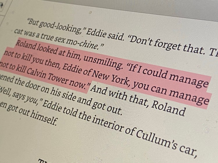 Mia on the other hand, is not given such consideration. I suppose many will think she doesn’t deserve it, but, maybe because I’m now a father, and have newfound sympathy and respect for pregnant women, upon this reading I was surprised to find myself feeling sorry for her in a way I never had before. Susannah has spent almost her entire time in New York trying to convince Mia that Sayre won’t keep his promise to let her keep the chap, but at no time does Susannah offer the same promise in earnest. From the moment the ka-tet discovers the existence of Mia, she is treated as a problem to be dealt with—and she very much is, just like Tower—but they never think to solve the problem of Mia with the same level of patience and respect.